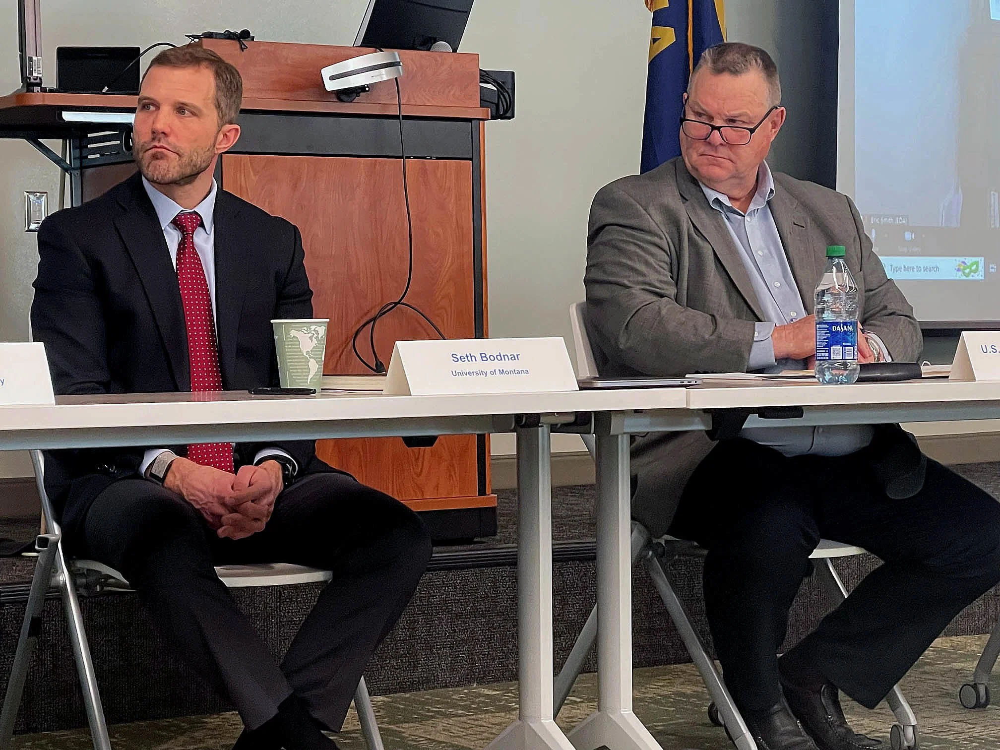 Sen. Jon Tester, right, and University of Montana President Seth Bodnar discuss the Tech Hub program during a panel earlier this year. (Martin Kidston/Missoula Current file)